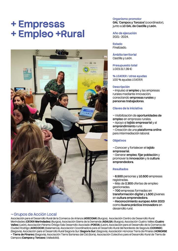 Este proyecto, desarrollado entre 2021 y 2024, contó con la participación de otros diez Grupos de Acción Local de Castilla y León, consolidándose como una experiencia de cooperación territorial de gran alcance. Su inclusión en la publicación supone un reconocimiento a su contribución en la dinamización económica y la generación de oportunidades en el medio rural, alineándose con los objetivos estratégicos del enfoque LEADER.
